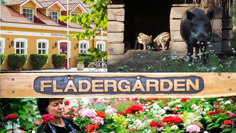 Nöjda med besöket här tar vi oss en liten bit till Flädergården som är ett lantbruk där de odlar fläderbuskar som sedan plockas manuellt och tas tillvara i deras hemkokeri. På Flädergården tillverkas cirka 15 olika fläderprodukter. Här får vi en god kopp kaffe och deras specialitet, fläderblomsvåfflor. Här finns även Pelargonhuset som har mellan 600–700 olika sorters pelargoner att beskåda, ett besök här är nästan ett måste. Det blir även tid att strosa runt och njuta av områdets natur.